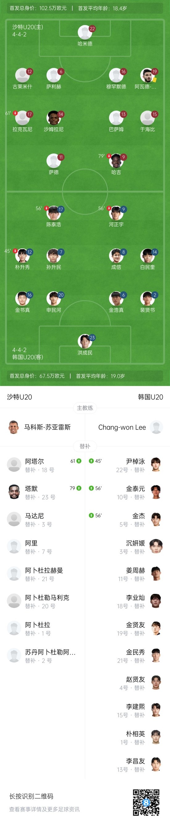 下半場補時3分鐘,U20沙特0-0韓國U20。
