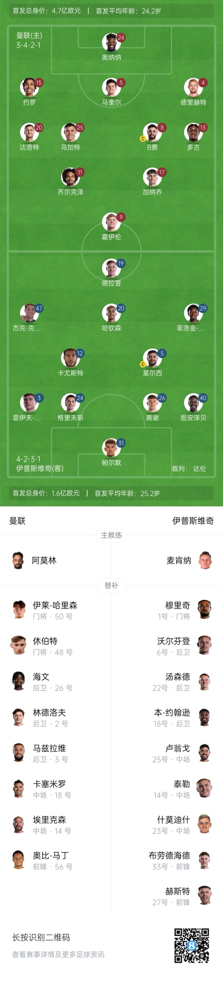 曼聯(lián)首發(fā):24-奧納納、4-德里赫特、5-馬奎爾、15-約羅、20-達(dá)洛特、25-烏加特、8-B費、13-多爾古、17-加納喬、11-齊爾克澤、9-霍伊倫