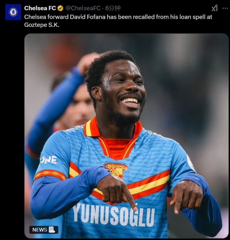 2月4日訊 切爾西官方宣布,22歲外租中鋒大衛(wèi)-福法納被召回。