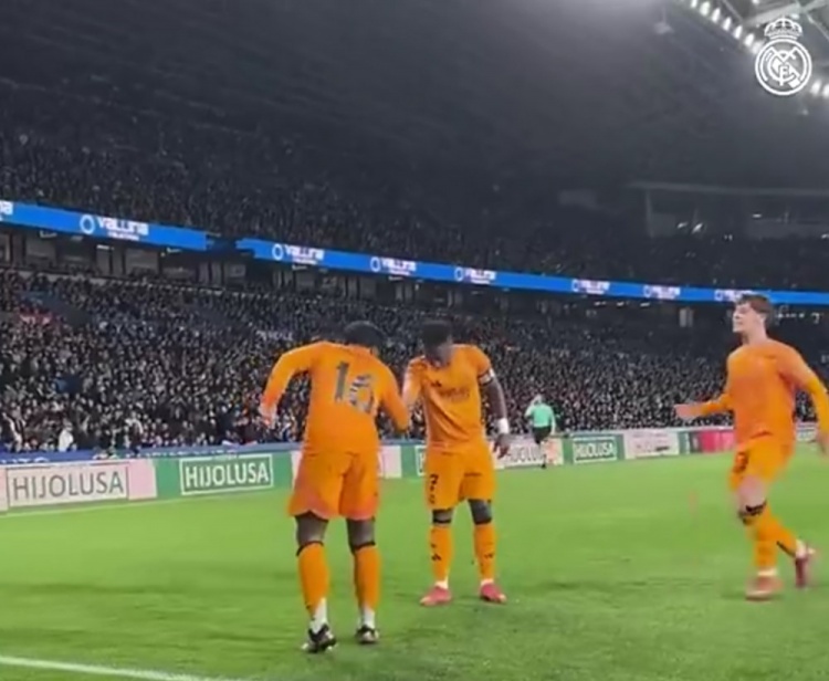 國(guó)王杯戰(zhàn)勝皇家社會(huì),恩德里克進(jìn)球后與維尼修斯握手慶祝
