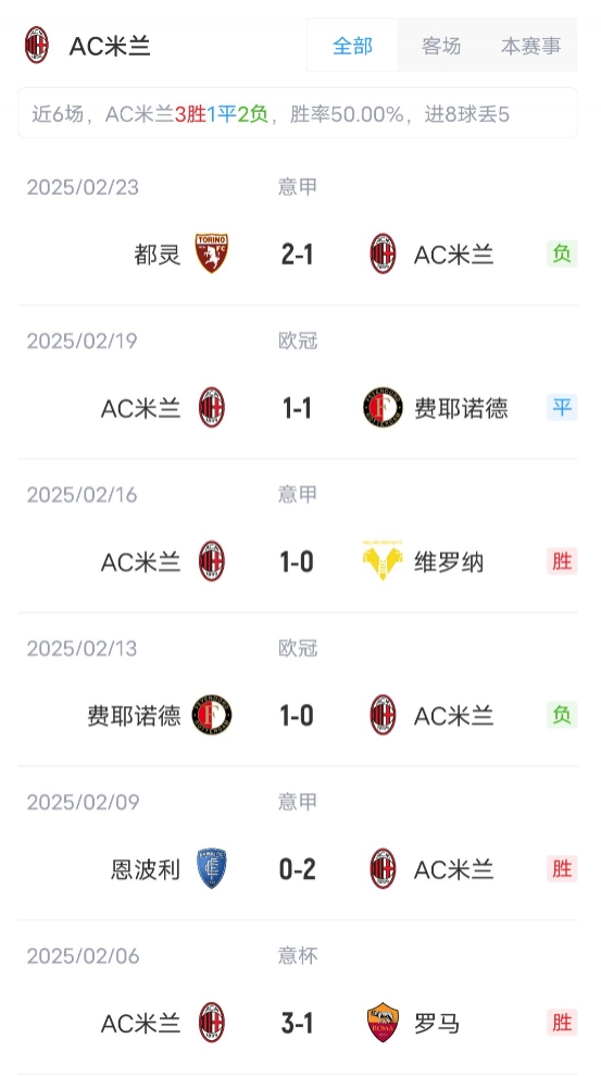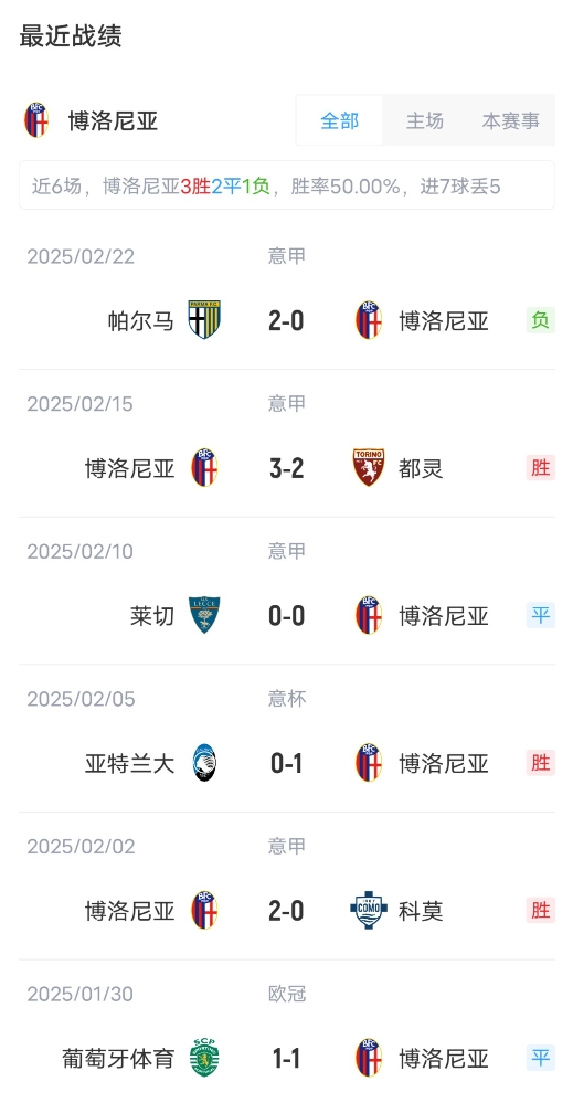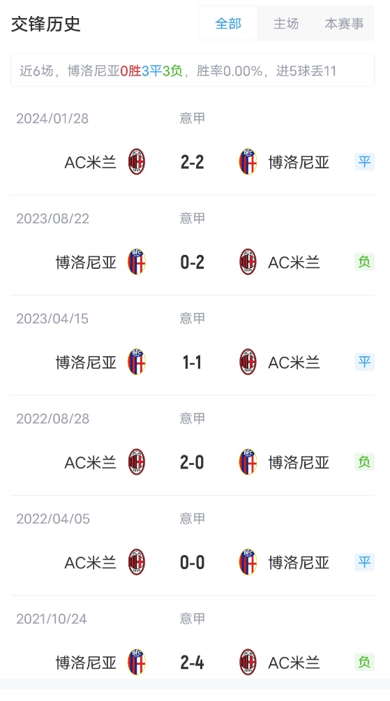 目前意甲25輪比賽過(guò)后,AC米蘭11勝8平6負(fù)積41分,位列意甲第7位。博洛尼亞10勝11平4負(fù)積41分,位列第8。