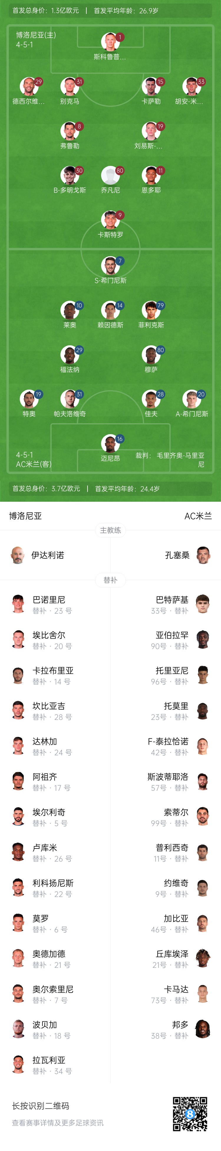 AC米蘭替補(bǔ):57-斯波蒂耶洛、96-托里亞尼、33-巴特薩基、46-加比亞、42-泰拉恰諾、23-托莫里、38-邦多、11-普利西奇、90-亞伯拉罕、73-卡馬達(dá)、21-丘庫(kù)埃澤、9-約維奇、99-索蒂爾