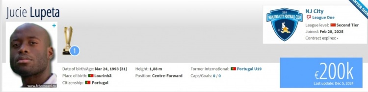 根據(jù)德轉(zhuǎn)信息,盧佩塔以自由轉(zhuǎn)會的方式加盟南京城市,他目前的身價為20萬歐。