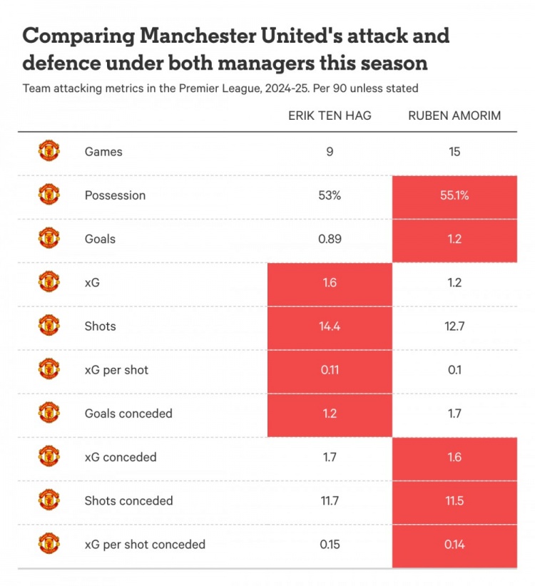 阿莫林加盟至今,曼聯(lián)在比賽中的關(guān)鍵指標是否發(fā)生了變化?