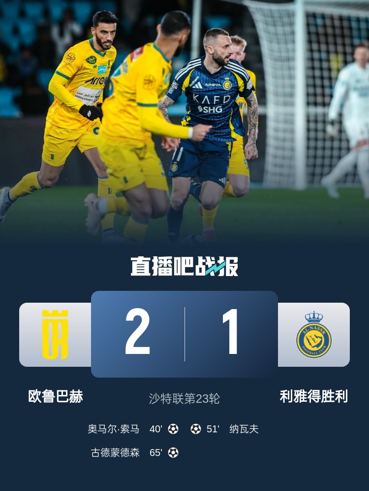 沙特聯(lián)第23輪,利雅得勝利1-2不敵歐魯巴赫。上半場,奧馬爾凌空斬;下半場,納瓦夫替補扳平,古德蒙德森世界波,C羅任意球被撲。