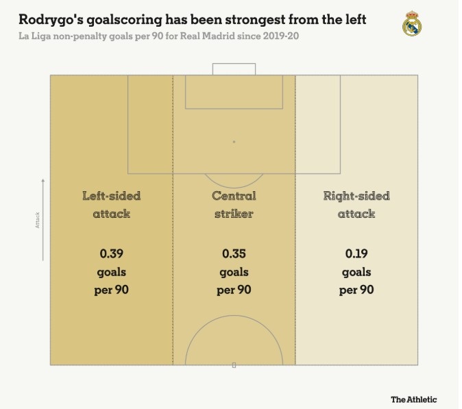 自2019年以來,羅德里戈在西甲位于左路位置時每90分鐘打進0.39球,而本賽季他在中路位置時每90分鐘打進0.35球,在右路位置每90分鐘打進0.19球。