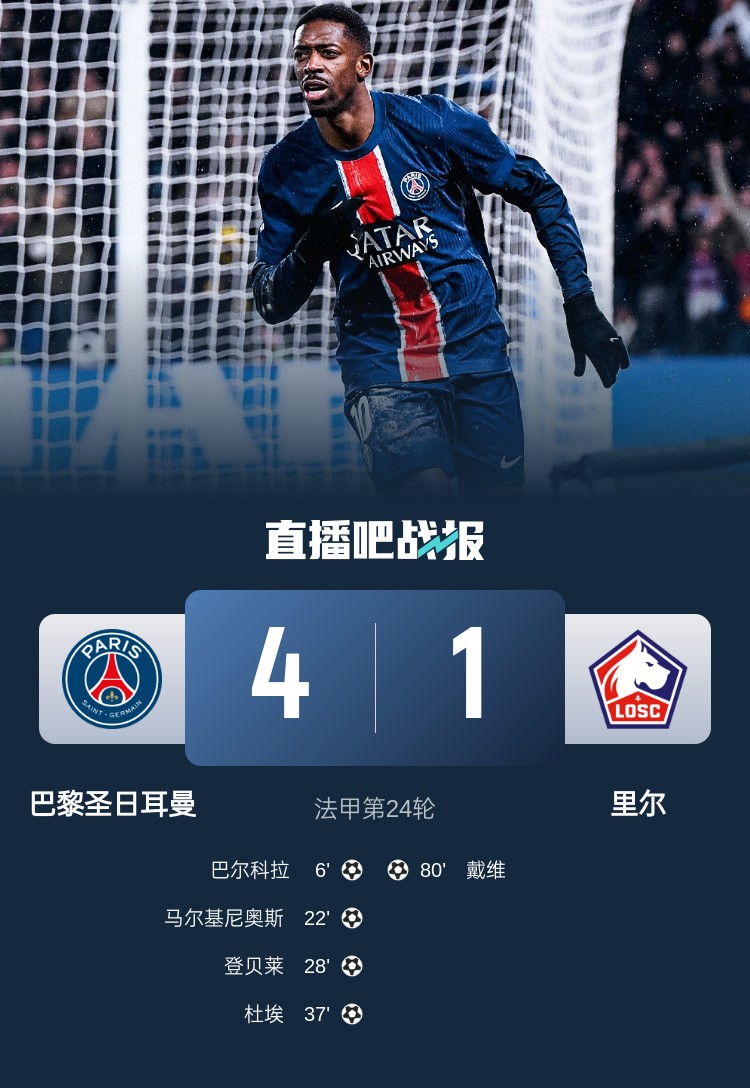 巴黎本輪4-1大勝里爾,此役后球隊(duì)10連勝,以16分優(yōu)勢(shì)領(lǐng)跑。
