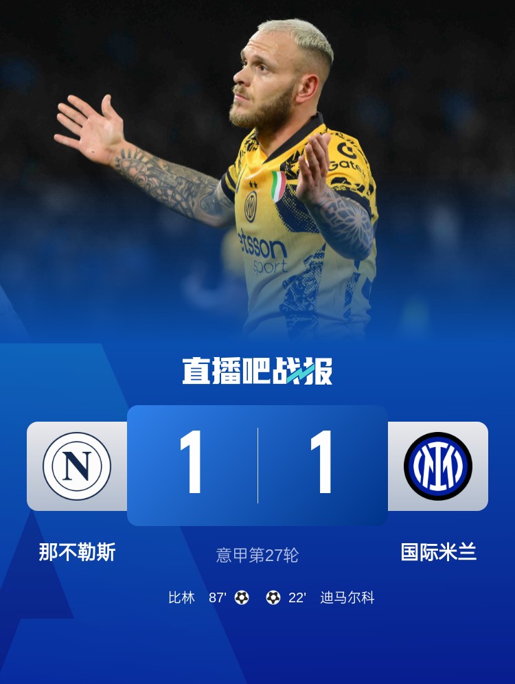 意甲本輪焦點(diǎn)大戰(zhàn),那不勒斯主場(chǎng)1-1戰(zhàn)平國(guó)米,雙方進(jìn)球者為比林和迪馬爾科,國(guó)米方面迪馬爾科和恰20均傷退。