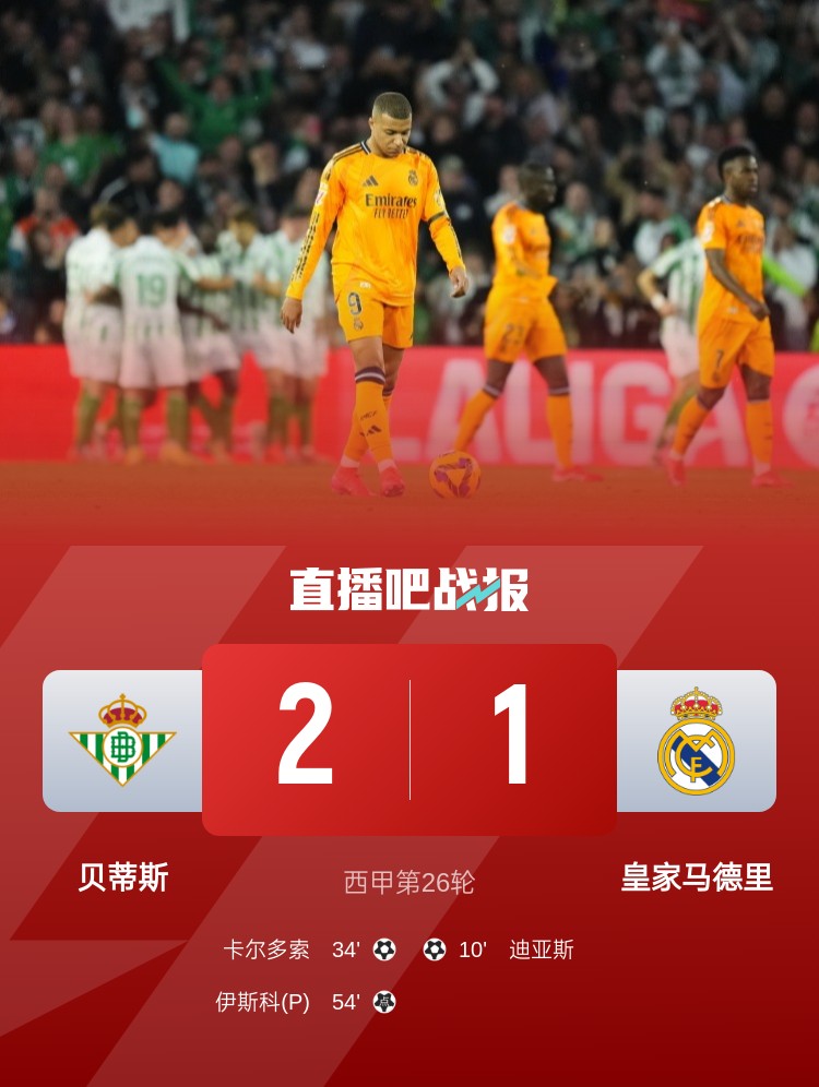 3月2日訊 本輪西甲,貝蒂斯2-1戰(zhàn)勝皇馬。