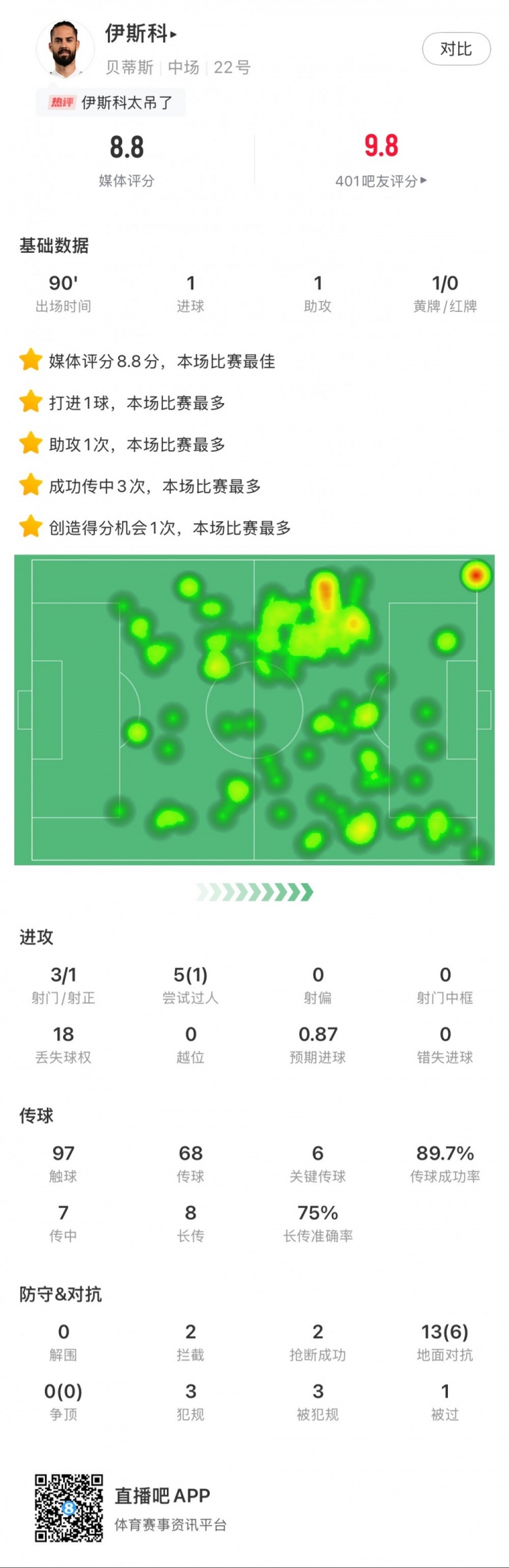 3月2日訊 本輪西甲,貝蒂斯2-1戰(zhàn)勝皇馬。伊斯科本場(chǎng)數(shù)據(jù):