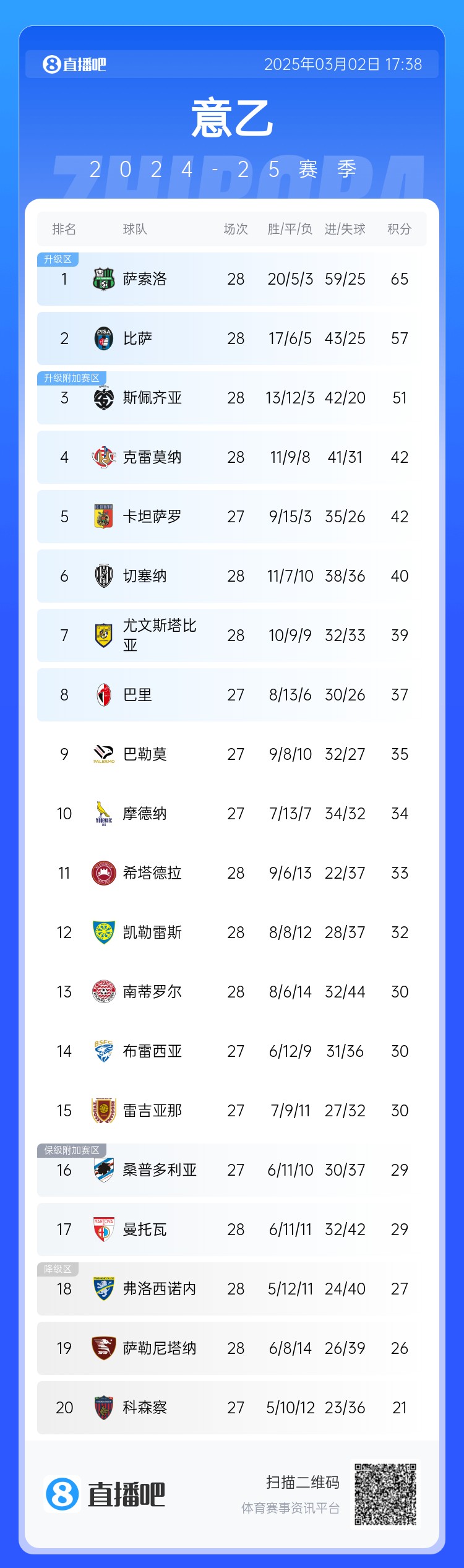 本輪意乙焦點戰(zhàn),法比奧·格羅索執(zhí)教的薩索洛1:0擊敗菲利普·因扎吉執(zhí)教的比薩,繼續(xù)穩(wěn)居積分榜首位,領(lǐng)先第三名14分,重返意甲或許只是時間問題。比薩雖然輸球,但仍居第二位,領(lǐng)先第三名6分。