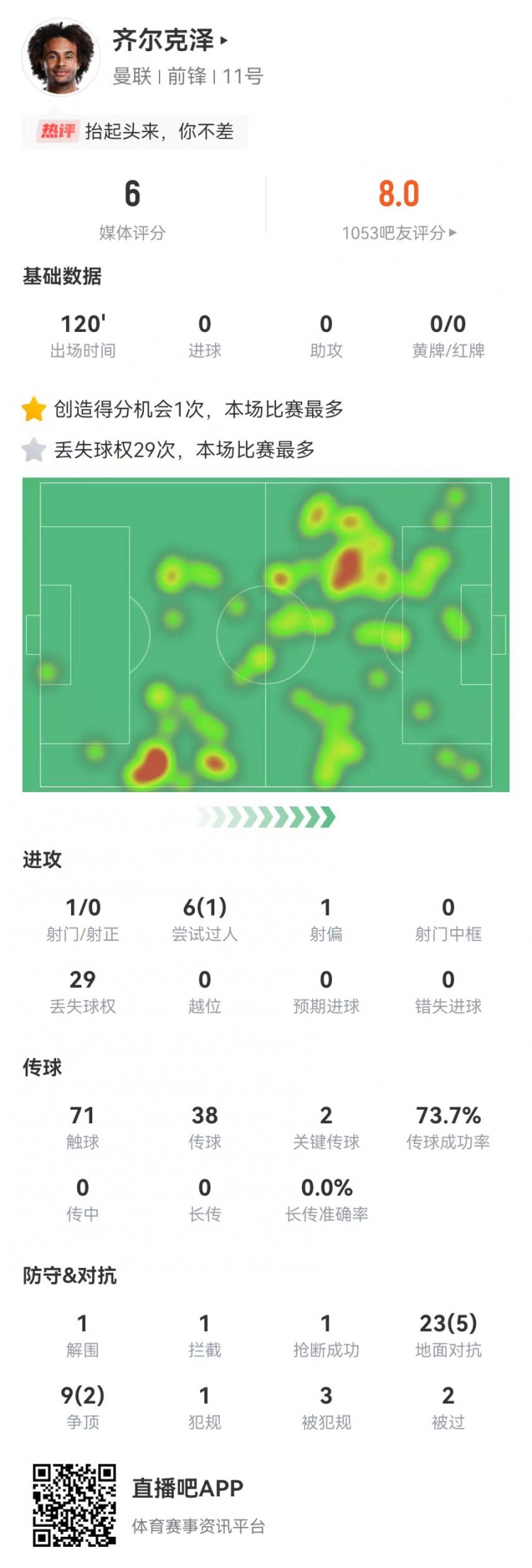3月3日訊 曼聯(lián)在本輪足總杯被富勒姆點(diǎn)球淘汰,齊爾克澤本場數(shù)據(jù)如下: