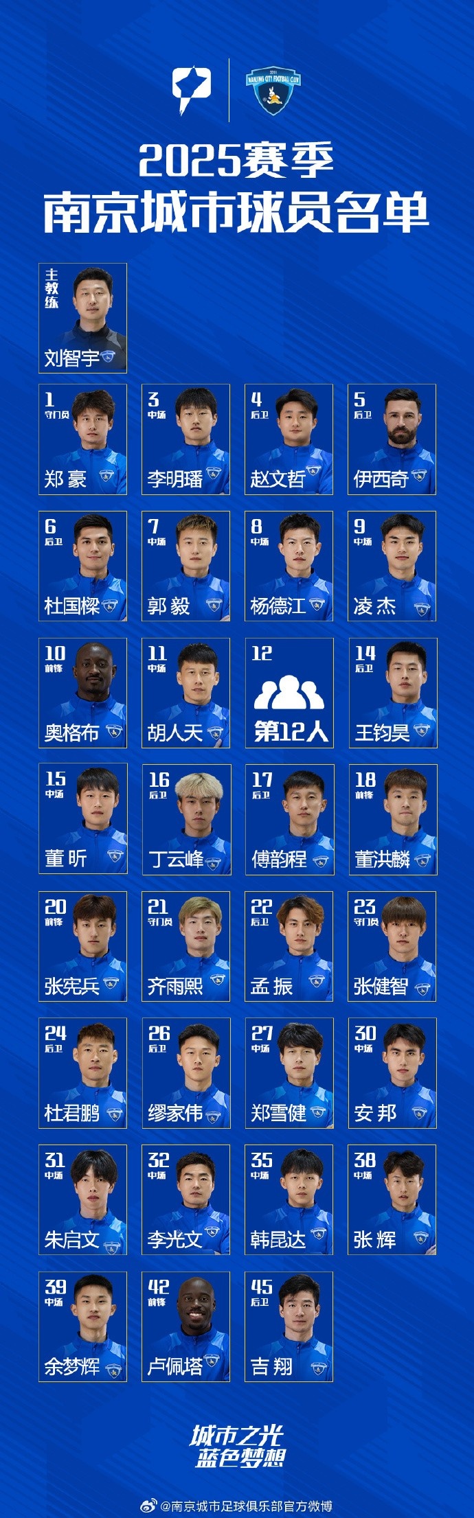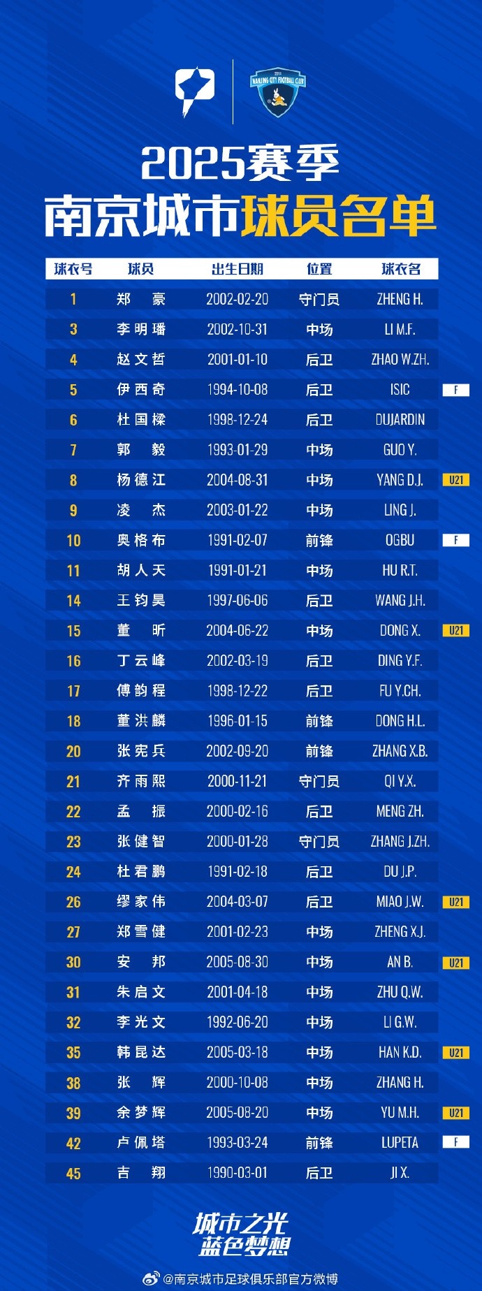 2025賽季南京城市一線隊(duì)大名單正式公布!