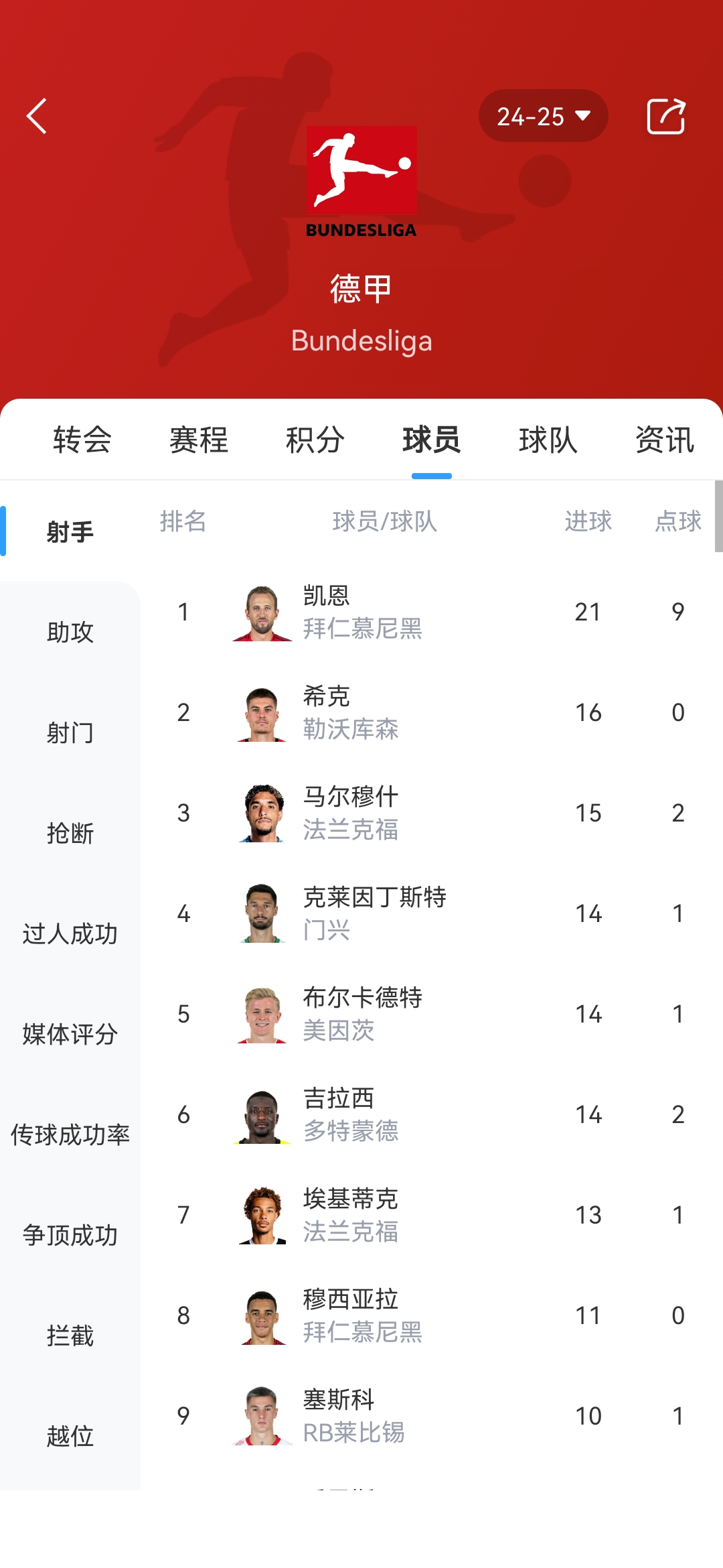 德甲射手榜:
