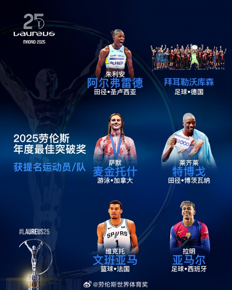 3月3日訊 官方消息,2025勞倫斯世界體育獎(jiǎng)“年度最佳突破獎(jiǎng)”提名,勒沃庫森、亞馬爾、文班亞馬入圍,去年這一獎(jiǎng)項(xiàng)的獲獎(jiǎng)?wù)呤怯⒏裉m足球運(yùn)動(dòng)員貝林厄姆。