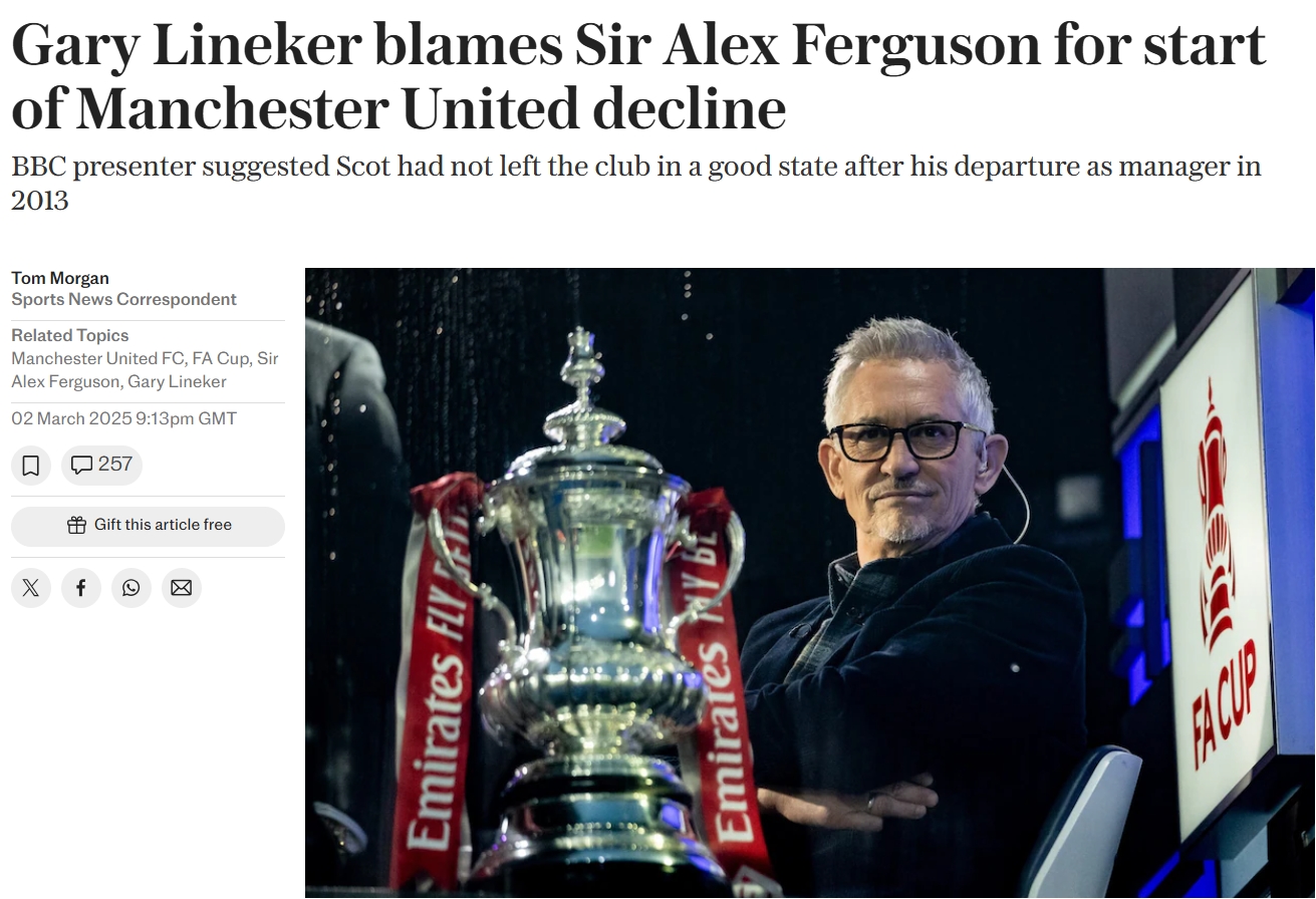 03月03日訊 英格蘭名宿、評論員萊因克爾在評述時表示,曼聯如今衰落的原因可以追溯到2013年弗格森的離任。