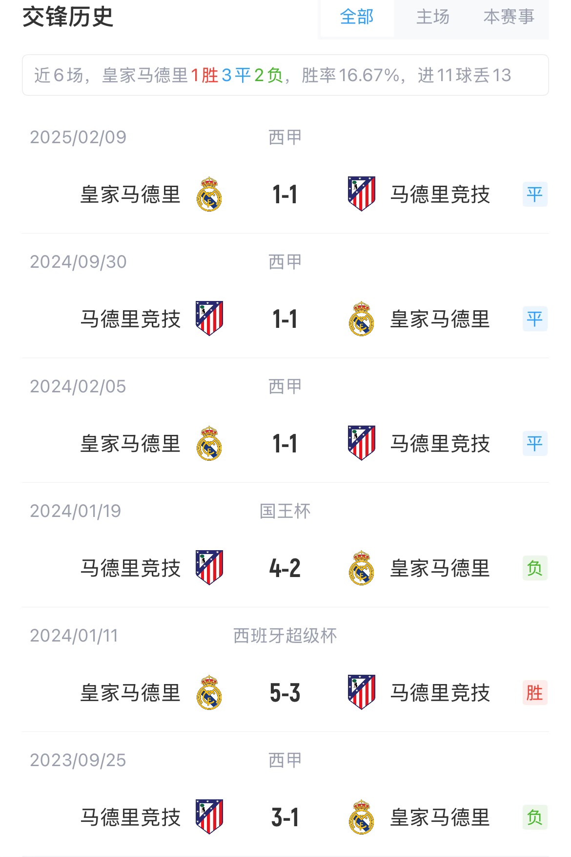 皇馬與馬競在歐戰(zhàn)共交手10次,皇馬5勝2平3負(fù),其中兩次在歐冠決賽戰(zhàn)勝馬競。本賽季,兩隊在西甲的兩次對決均戰(zhàn)成1-1。