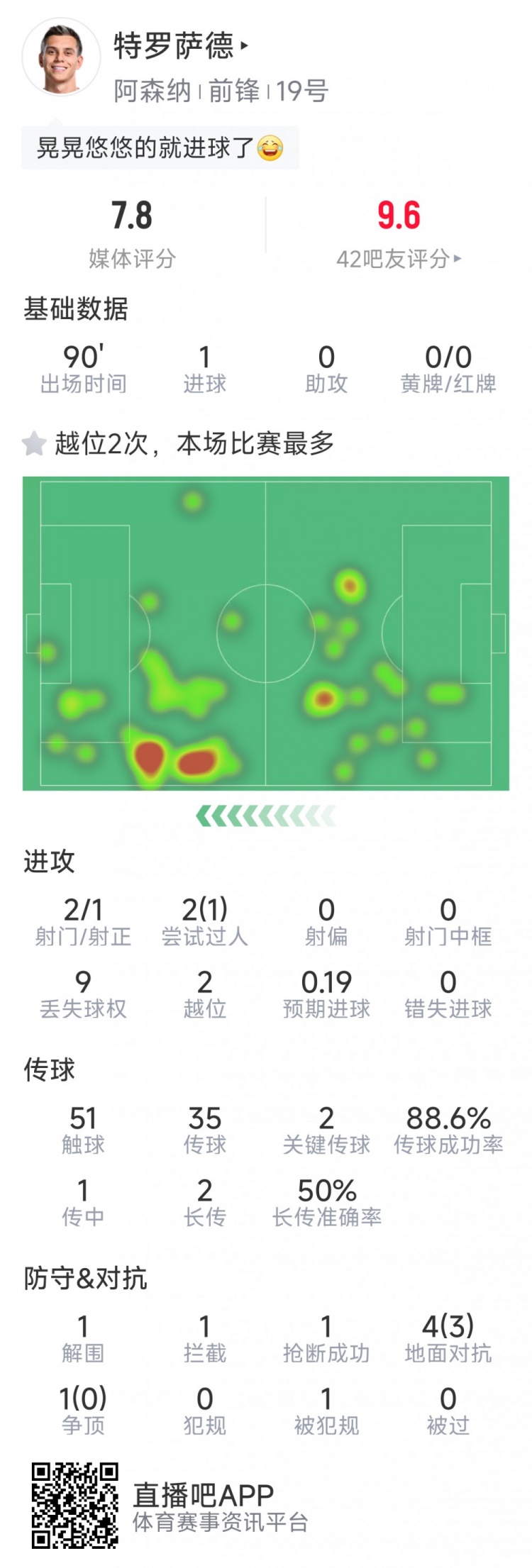 3月5日訊 在本輪歐冠阿森納7-1大勝埃因霍溫的比賽中,特羅薩德打進(jìn)一球。以下為他在本場(chǎng)數(shù)據(jù):