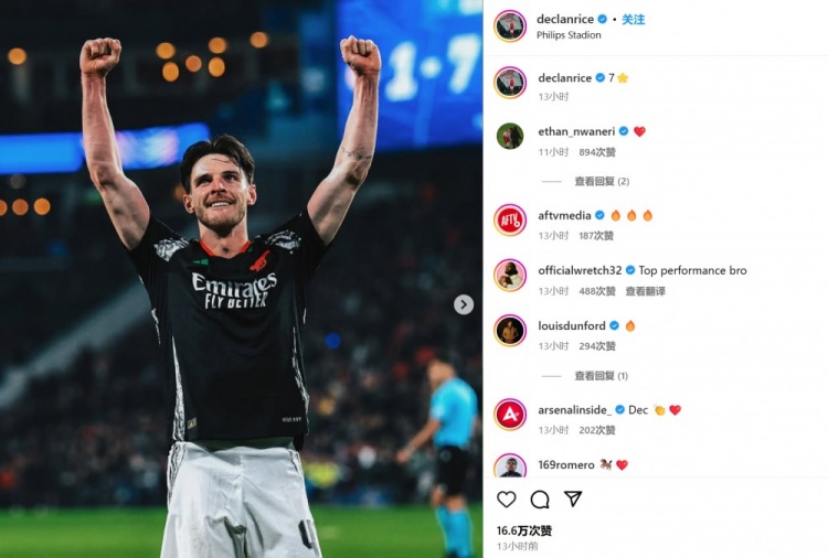 厄德高在本場比賽2射1傳,賴斯也送出1次助攻,兩人都通過社媒曬出自己的慶祝照,并簡單配文“7”。