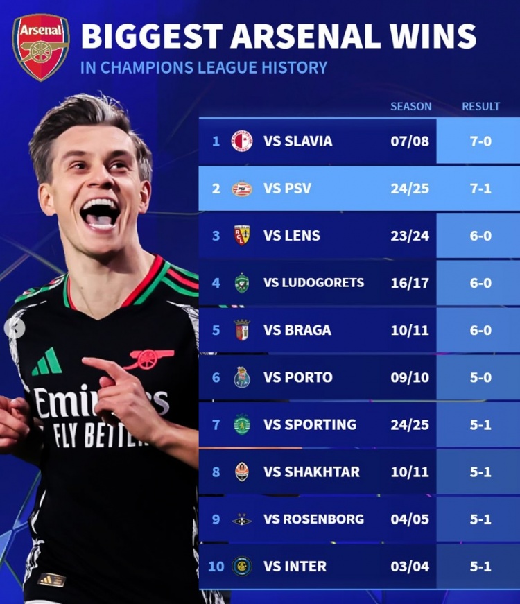 德轉(zhuǎn)列阿森納隊(duì)史歐冠單場大勝榜: