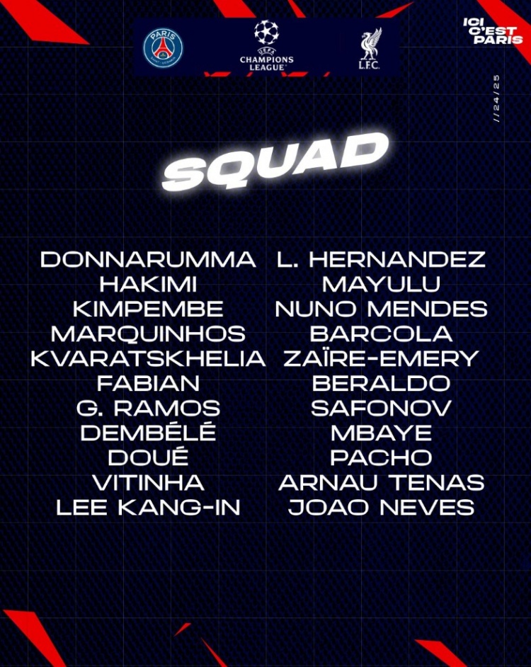 前鋒:7-克瓦拉茨赫利亞、9-貢薩洛-拉莫斯、10-登貝萊、14-杜埃、19-李剛?cè)省?/span>29-巴爾科拉、49-姆巴耶