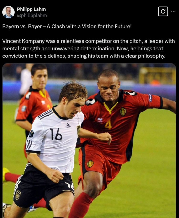 拉姆寫道:拜仁對(duì)陣?yán)瘴謳焐?,這是一場未來愿景之間的較量!在球場上,孔帕尼是一位不屈不撓的斗士,一位擁有強(qiáng)大精神力量和堅(jiān)定決心的領(lǐng)袖?,F(xiàn)在,他將這種信念帶到了教練席,正在用清晰的理念塑造他的球隊(duì)。