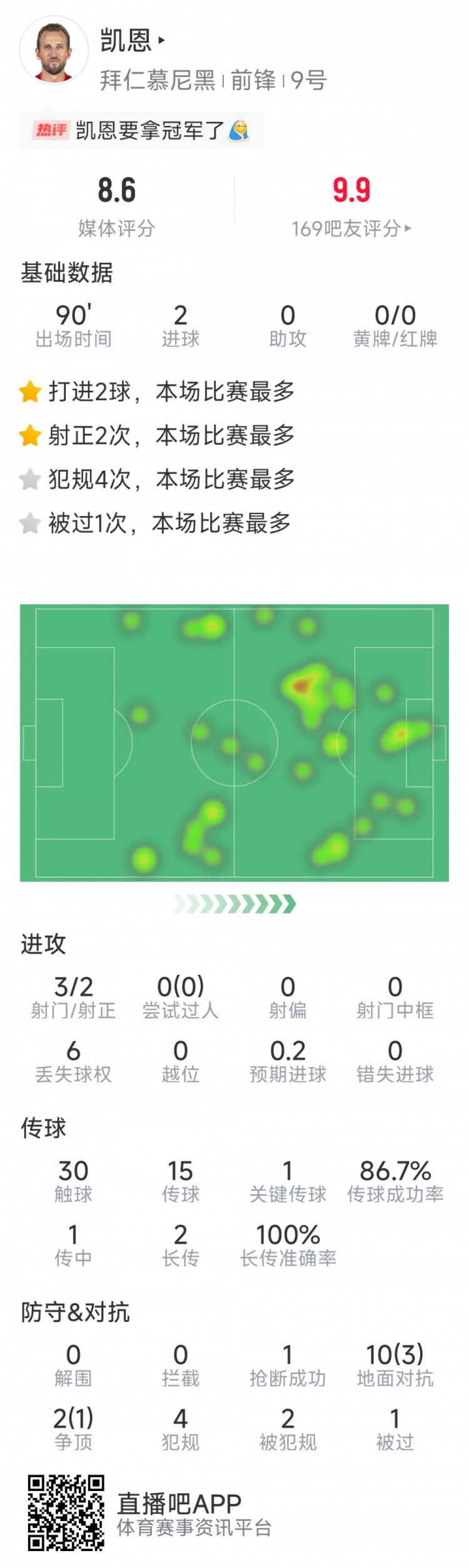 3月6日訊 在本輪歐冠拜仁3-0擊敗勒沃庫森的比賽中,凱恩梅開二度。以下為他在本場數(shù)據(jù):