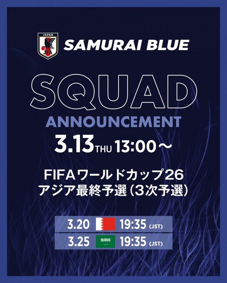 3月7日訊 根據(jù)日本國家隊官方的消息,日本隊3月份世預賽名單將在3月13日公布。