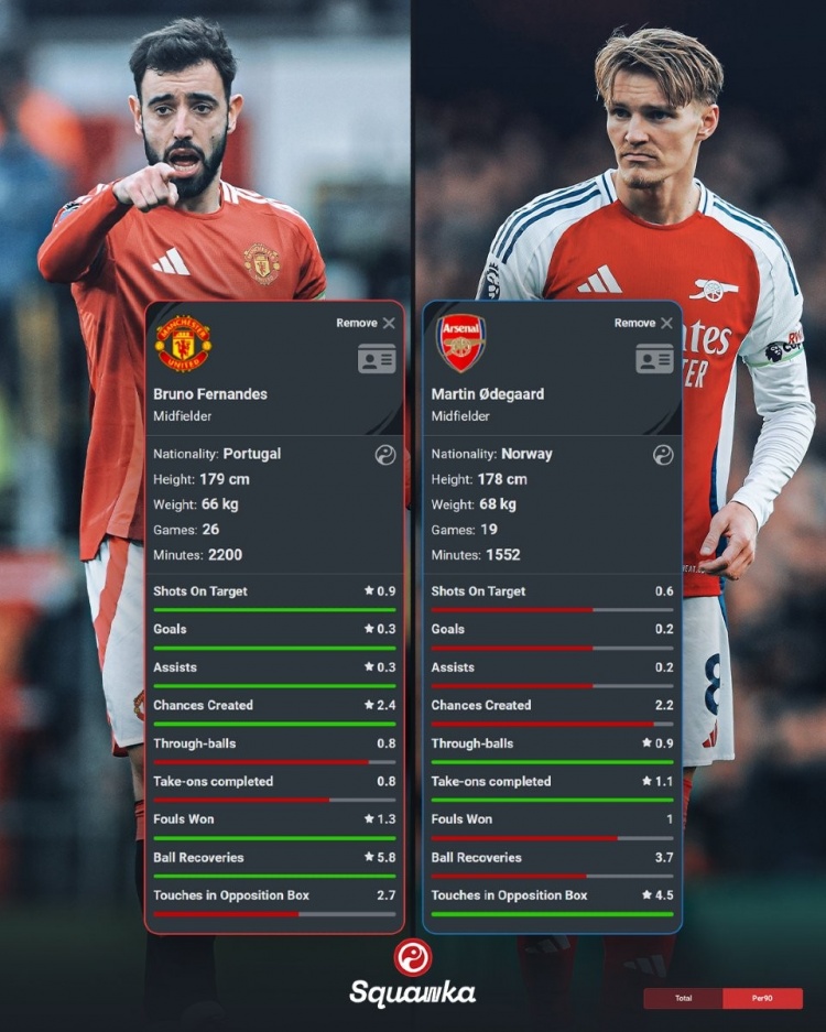 3月8日訊 曼聯(lián)將在本輪英超迎戰(zhàn)阿森納,數(shù)據(jù)機(jī)構(gòu)squakwa也對(duì)比了兩隊(duì)核心的本賽季英超每90分鐘關(guān)鍵數(shù)據(jù),B費(fèi)在多項(xiàng)數(shù)據(jù)領(lǐng)先。