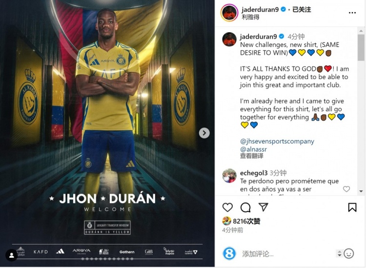 2月2日訊 維拉前鋒杜蘭加盟利雅得勝利,據(jù)悉轉(zhuǎn)會費7700萬歐加浮動,杜蘭在社交媒體上曬出海報,談到了加盟的感想。