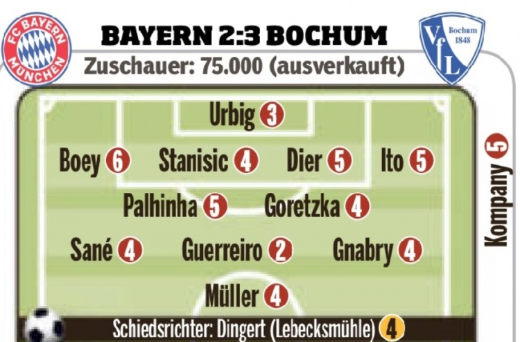 3月9日訊 拜仁在本輪德甲2-3被波鴻逆轉(zhuǎn),《圖片報(bào)》在賽后按照慣例進(jìn)行了評(píng)分,博伊被打出象征災(zāi)難級(jí)的6分。