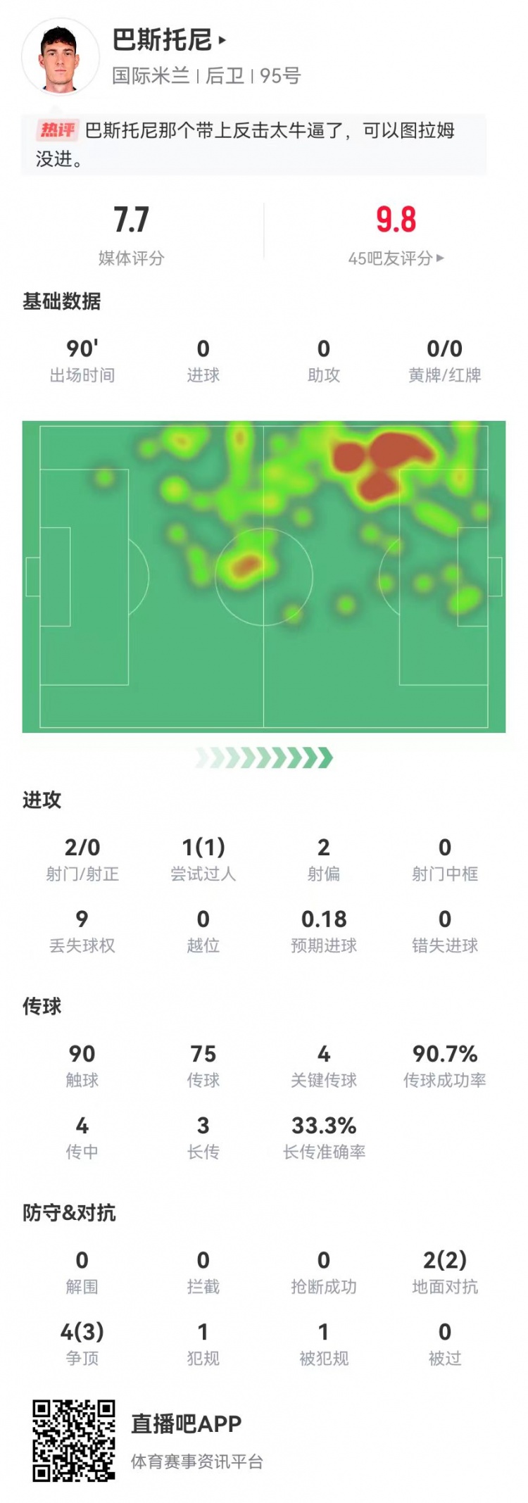 3月9日訊 國米在本輪意甲3-2逆轉(zhuǎn)蒙扎,巴斯托尼本場(chǎng)數(shù)據(jù)如下: