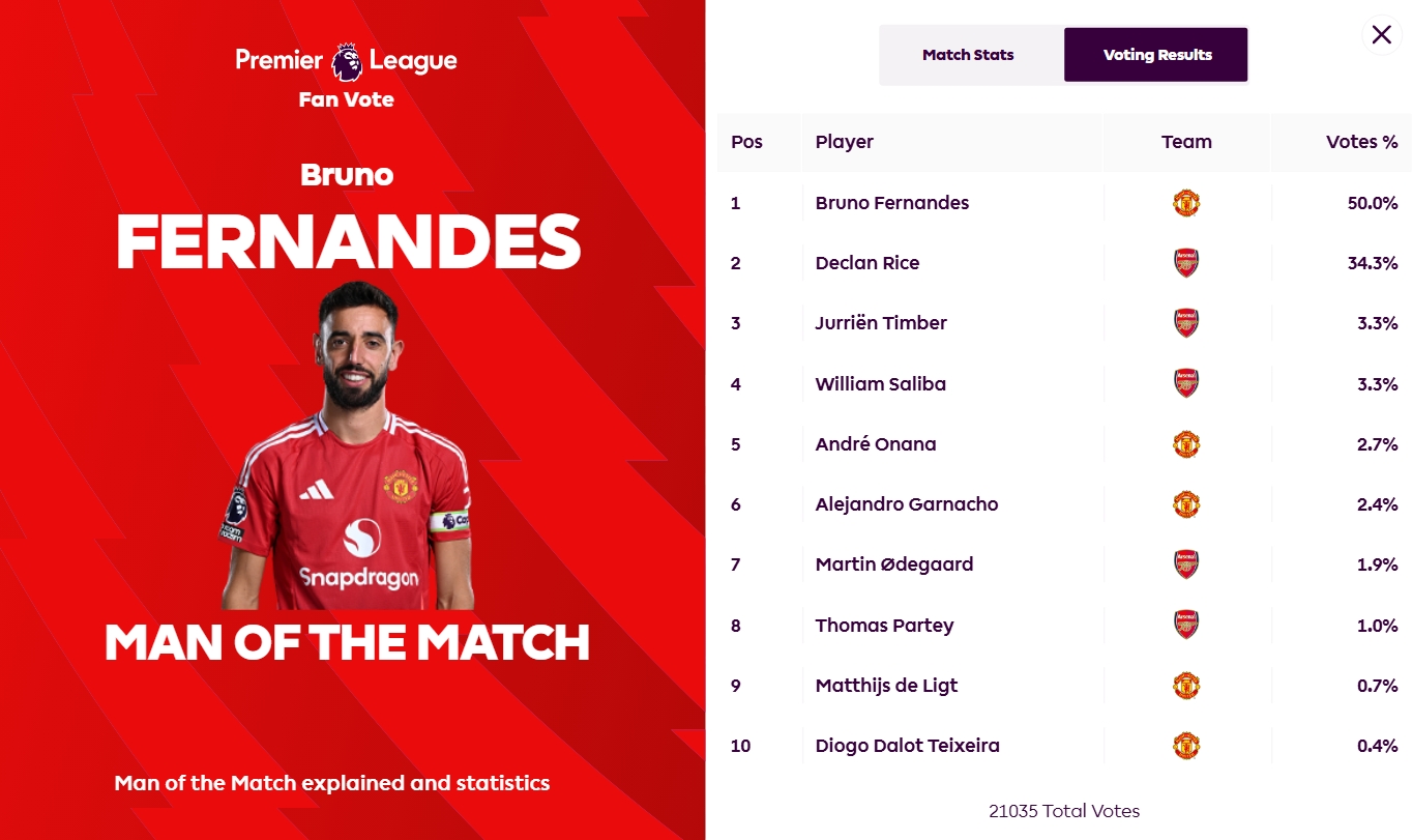 本場(chǎng)比賽,B費(fèi)打入一個(gè)任意球世界波,為曼聯(lián)首開記錄,賽后他獲得50%的票數(shù),被評(píng)為全場(chǎng)最佳。