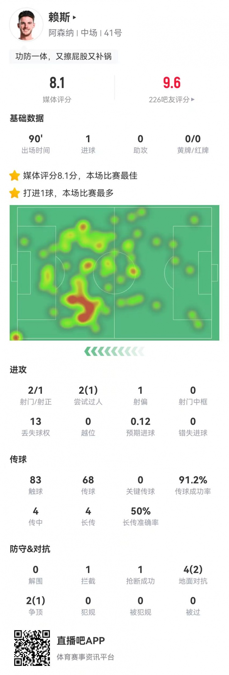 3月10日訊 阿森納在本輪英超客場(chǎng)1-1戰(zhàn)平曼聯(lián),賴斯本場(chǎng)數(shù)據(jù)如下: