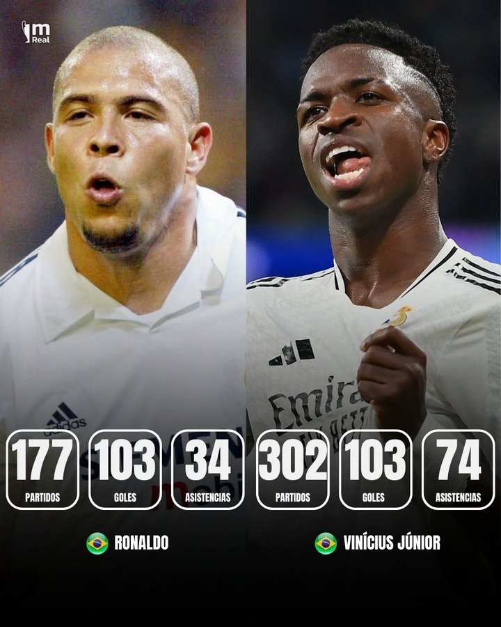 統(tǒng)計表明,維尼修斯現(xiàn)在已經(jīng)為皇馬打進103球,追平同胞羅納爾多,成為皇馬隊史進球并列最多的巴西球員。