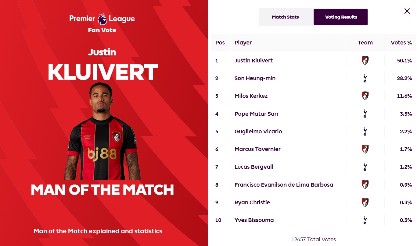 本場(chǎng)比賽伯恩茅斯前鋒小克魯伊維特發(fā)揮出色,送出一次助攻,賽后他也以超過50%的得票率當(dāng)選英超官方球迷票選全場(chǎng)最佳球員。