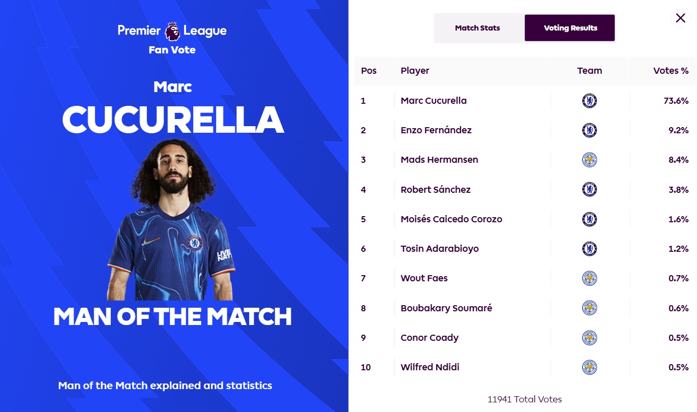 3月10日訊 英超第28輪,切爾西1-0萊斯特城。庫庫雷利亞首發(fā)出戰(zhàn),賽后以73.6%得票率當(dāng)選全場最佳。