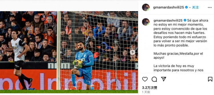 賽后瑪瑪達(dá)什維利更新社媒致歉,他寫道:“我清楚自己目前并不在最佳狀態(tài),但是困難會讓人變得更加堅強(qiáng),接下來我會盡我所能拿出最佳水平。非常感謝梅斯塔利亞球迷們的支持!這場勝利非常重要,并且讓我們打起干勁繼續(xù)應(yīng)對之后的每一場比賽。繼續(xù)前進(jìn)!”