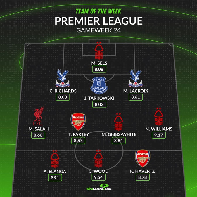 2月4日訊 英超第24輪比賽戰(zhàn)罷,WhoScored根據(jù)球員評分排出了本輪最佳陣容,薩拉赫、哈弗茨、托馬斯在列,諾丁漢森林5名球員入選。