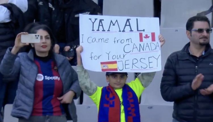 這位小球迷手舉橫幅,上面寫著:“亞馬爾,我來自加拿大,想要你的球衣!”