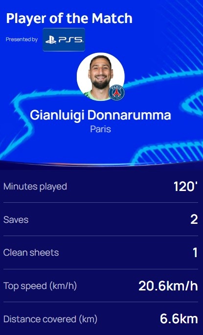 本場比賽巴黎門將多納魯馬發(fā)揮出色,在120分鐘時間做出2次撲救,并且在點(diǎn)球大戰(zhàn)中兩次撲出對手點(diǎn)球。