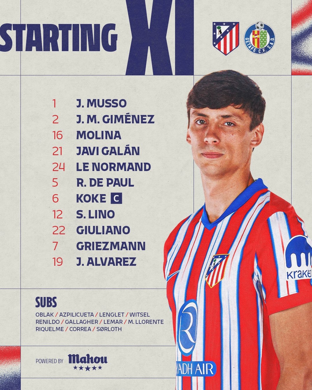 馬競(jìng)首發(fā):1-穆索、2-吉梅內(nèi)斯、16-莫利納、21-加蘭、24-勒諾爾芒、5-德保羅、6-科克、12-利諾、22-朱利亞諾-西蒙尼、7-格列茲曼、19-阿爾瓦雷斯