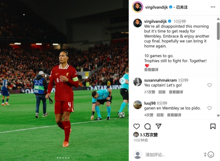 范迪克也在社媒發(fā)文寫道:“今天早上我們每個(gè)人都很失望,但現(xiàn)在是時(shí)候?yàn)闇夭祭驁?chǎng)的決賽做好準(zhǔn)備了。擁抱并享受又一場(chǎng)決賽,希望我們能再次把獎(jiǎng)杯帶回家。賽季還剩10場(chǎng)比賽,還要為冠軍而拼搏。我們一起加油!”
