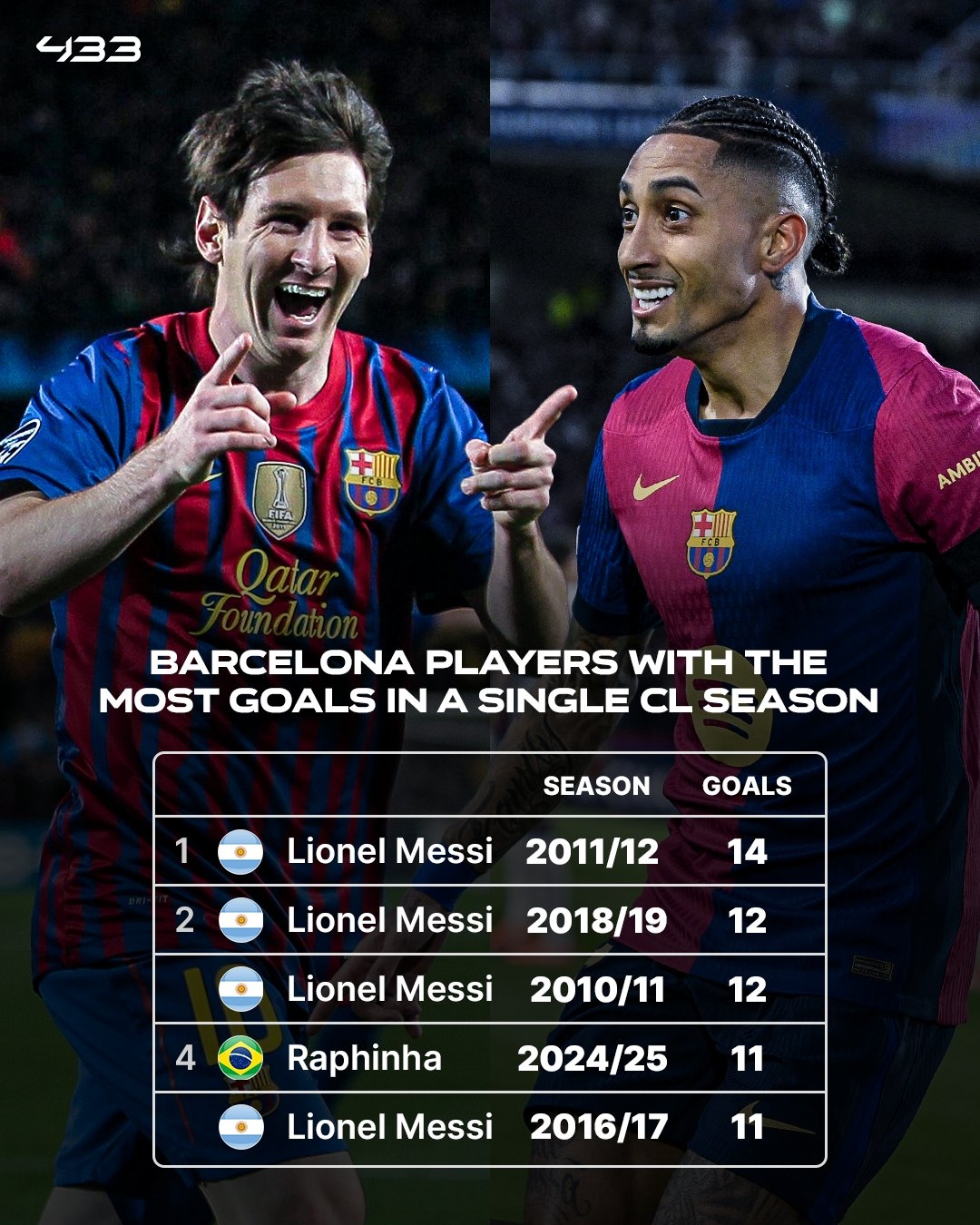 巴薩隊史個人單賽季進球紀錄中,拉菲尼亞本賽季11球進入前五,其余四席均是梅西。
