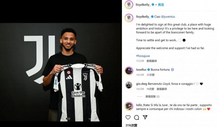 凱利通過社媒曬出自己手持尤文球衣的加盟照,并配文:“你好(ciao,意大利語),@尤文圖斯俱樂部?!?/p>