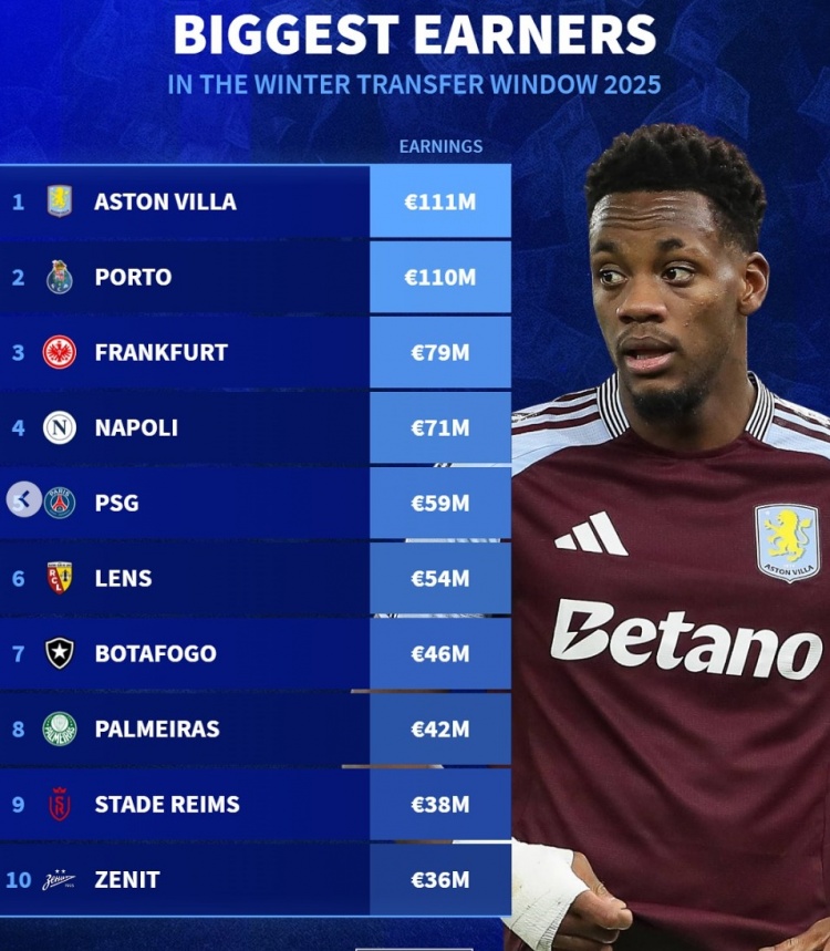 2月5日訊 五大聯(lián)賽已經(jīng)關(guān)窗,《轉(zhuǎn)會市場》也統(tǒng)計(jì)了今年冬窗各隊(duì)收入情況,維拉力壓波爾圖居首。