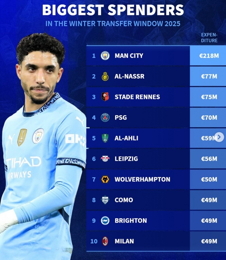 2月5日訊 五大聯(lián)賽冬窗已經(jīng)關(guān)閉,《轉(zhuǎn)會市場》統(tǒng)計(jì)了今年冬窗各俱樂部支出情況,曼城無懸念居首。