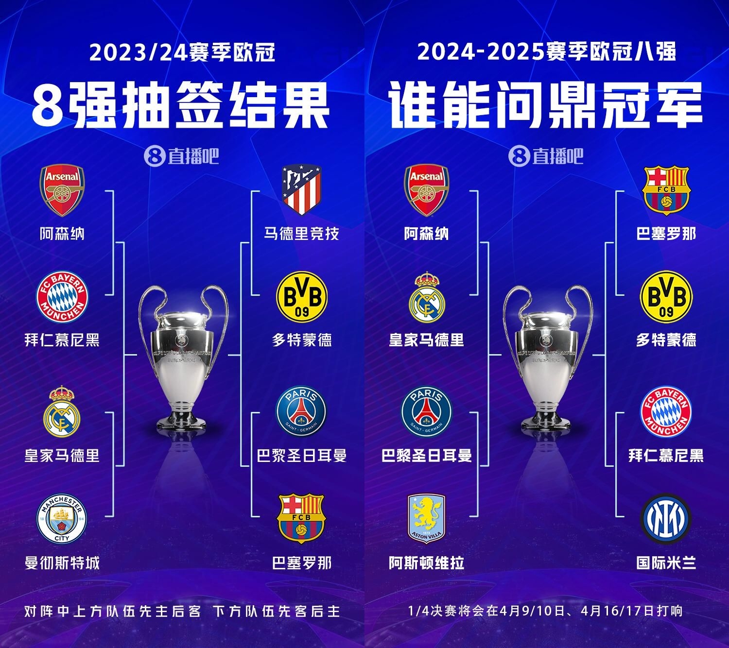 24/25賽季歐冠8強:阿森納vs皇馬,巴黎vs維拉,巴薩vs多特,拜仁vs國米