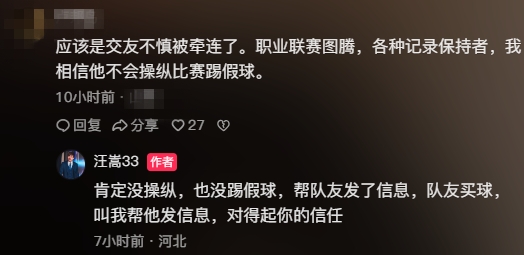 網(wǎng)友:應(yīng)該是交友不慎被牽連了。職業(yè)聯(lián)賽圖騰,各種記錄保持者,我相信他不會(huì)操縱比賽踢假球。