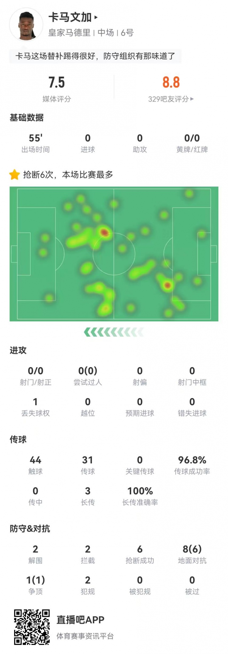 3月13日訊 皇馬在本輪歐冠點球淘汰馬競,卡馬文加數(shù)據(jù)如下: